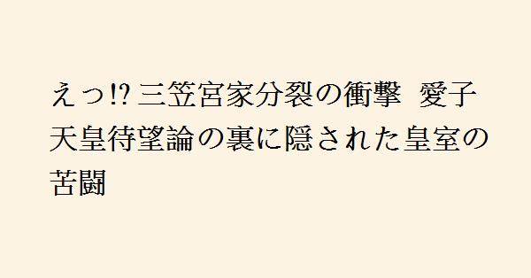 背景には三笠宮家の分裂問題があり、昨年11月の百合子妃の死去により発生した母子の確執は、「親王妃家」という過去にない事態を招いています。国民は皇室の円滑な運営に懸念を抱き、女性天皇や女系天皇の容認を訴えています。