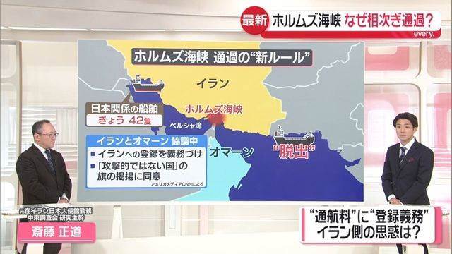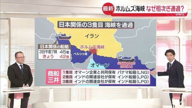 イランによるホルムズ海峡の事実上の封鎖下、6日までに日本関連の船3隻が危険水域を脱出しました。これらは商船三井に関わる船で、多国籍所有のLNGおよびLPG輸送船です。イランはオマーンやインドなど友好国との経済関係を重視し、彼らの関連船舶の通航を妨害しなかった模様です。一方、イランとオマーンは、海峡を通過するタンカーにイラン登録や「非敵対的な国」の旗掲揚を義務付ける新たなルールを協議中。イスラエル関連の船舶の通航は制限される可能性があります。