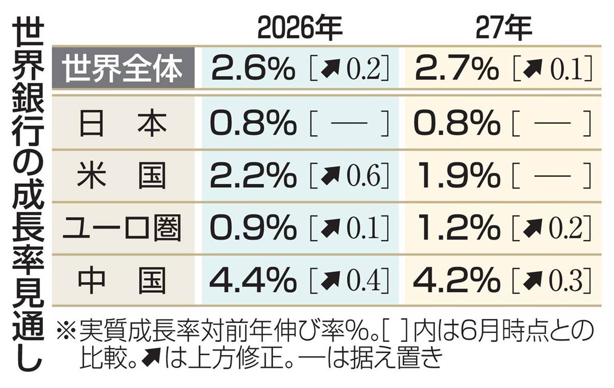世界銀行は2026年の世界経済成長率を2.6%と予測しました。昨年6月の見通しから0.2ポイント上方修正され、金融緩和や財政拡張策が成長を下支えするとされています。米国経済の堅調さが特に影響している一方で、日本は2025年の1.3%から2026年には0.8%に減速すると予測され、外需低迷が原因とされています。また、2027年は2.7%の成長率が予測されており、安定を維持する見込みですが、2020年代は1960年代以来、最も成長率が低い10年間になるとの懸念が示され、世界的な格差拡大を警戒。不確定要素として貿易摩擦の激化が挙げられています。