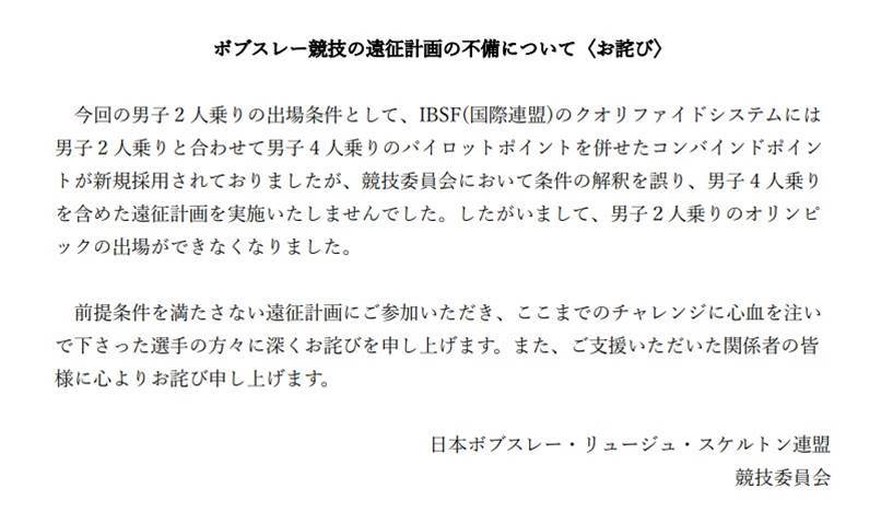 日本ボブスレー・リュージュ・スケルトン連盟は、基準解釈の誤りによって男子2人乗りのミラノ・コルティナ五輪出場資格を失ったことを発表しました。この失態は、IBSFの予選方式変更を正確に理解せず、男子4人乗りを含む必要がある遠征計画を怠ったためとされています。この結果、選手は一部予選基準を満たさない状況となり、遠征計画に注力してきた関係者や選手、支援者に重大な精神的負担と失望をもたらしました。JOCは責任の所在を重く受け止め、再発防止策を命じています。