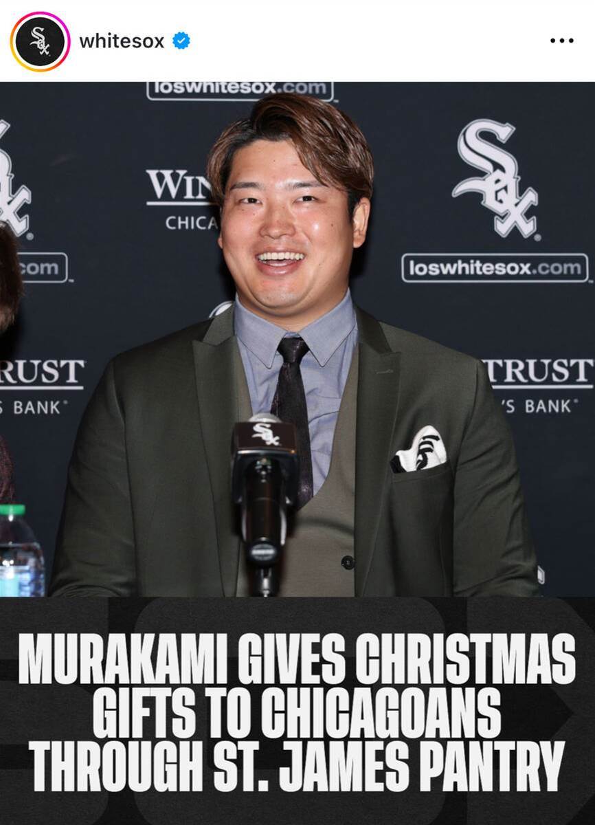 村上宗隆内野手は、ヤクルトからポスティングシステムを利用してホワイトソックスと2年総額3400万ドル(約53億7200万円)の契約を結び、シカゴで入団会見を行いました。村上は、シカゴ住民のために特別なことをしたいと考え、2万ドル(約314万円)を寄付しました。この寄付金は、貧困に直面するシカゴの100世帯に対する食料品ギフト券と、市民支援事業を支えるための資金に充てられました。