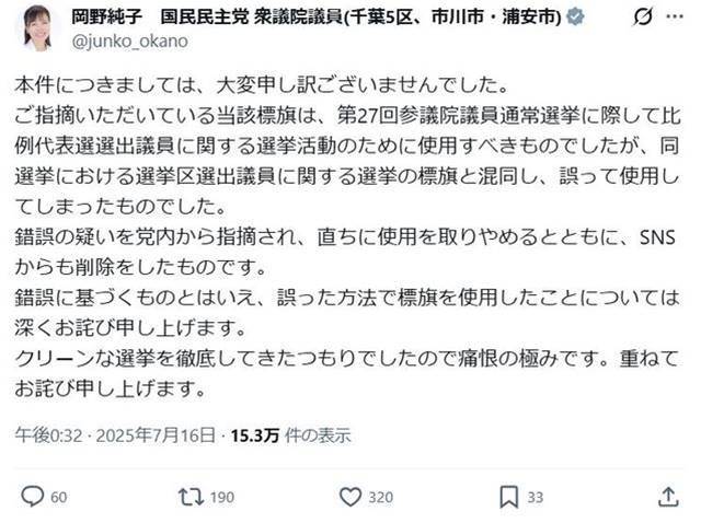 岡野純子氏が公職選挙法違反の疑いで書類送検されました。事件は、国民民主党の所属する岡野氏が、7月の参院選で千葉選挙区の公認候補・小林さやか氏の応援演説時に、選挙管理委員会の定めた正しい標旗を使用せずに演説を行ったことから発生しました。本来、候補者に対して支給される正しい標旗は候補者名が記載されている必要がありますが、岡野氏は党内の別の比例代表候補者に対して支給された標旗に小林氏の名前を記したものを使用しました。