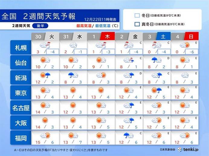 4、天気と関係ないけど、事務仕事の今年の仕事納めは一般的に29日迄がほとんどじゃないかなでも大体年末最終日はほとんどやる事ないから大掃除で午前中迄で、旅行の計画してる人は有給取るみたいな。ゴールデンウィークの天気予報も連休繋ぎを基本にしてるけど、中小はほとんど暦通りの飛び石連休が多い。