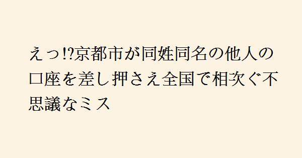 京都市で10月末、市民税滞納者として口座を差し押さえた際に、同姓同名で生年月日が同じだが異なる住所の人物の口座を誤って差し押さえるミスが発生した。この事例は全国でも頻発しており、京都市の担当者は戸籍の付票を確認すれば防げたと説明。市の約1万人の税滞納者を処理する中で見過ごされる可能性があるため、今後、確認手順やチェック体制の見直しを検討している。