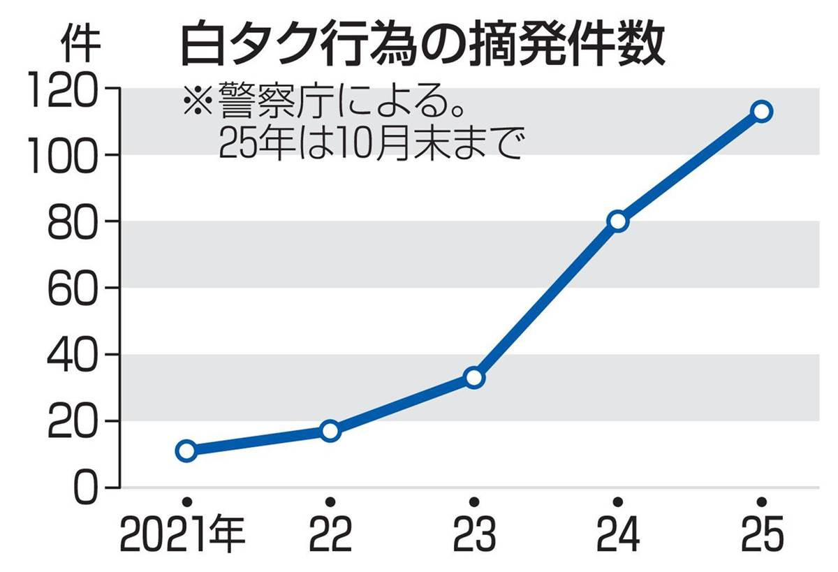 今年1~10月末で、無許可のタクシー営業、いわゆる「白タク」行為の摘発件数が113件に達し、過去最多となった。このうち、外国籍の摘発者は53人と半数以上を占め、訪日客の急増が背景にある。新型コロナウイルス禍の後、観光客が増える中、一部の外国人による不法な利益追求が問題となっている。高市政権は外国人による違法行為への対応を強化しているが、摘発件数は2021年の11件から今年は10倍に増加。