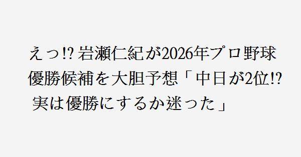 事件概要:元中日投手で野球評論家の岩瀬仁紀さんが、2026年のプロ野球セ・パ両リーグの順位予想を発表。セ・リーグ優勝を阪神、2位を中日、パ・リーグ優勝を日本ハムと見込む。過去の予想では阪神の独走優勝を的中させるも、“ピタリ賞”は不在。今年は各球団で故障者が相次ぎ、戦力に差が出た中で、故障の少なかった阪神が安定した結果を残した。