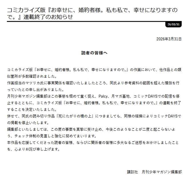 事件概要:講談社『月刊少年マガジン』編集部は2023年10月31日、コミカライズ版『お幸せに、婚約者様。私も私で、幸せになりますので。』の連載終了を発表した。作画担当のマツリカ氏による他作品の模倣が確認され、本人の申し出を受け停止が決定された。公式サイトで読者や関係者への謝罪が行われ、同氏の別作品『死にたがりの橋の上』も掲載停止処分となった。編集部は今回の問題を重く受け止め、チェック体制の見直しを進める意向を表明している。