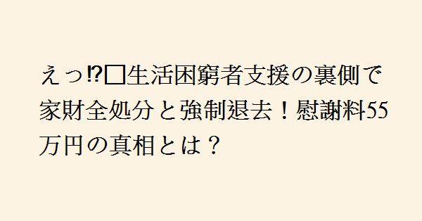 4、8月は期日の1日までに支払うことができませんでした。その後、不動産会社から8日までに支払わなければ強制退去になる旨の連絡を受けます。そして8月17日男性が外出先から帰宅すると部屋には不動産会社にTシャツ1枚キャリーケース1個を残して家財が全て処分されていました。→なんか経緯を困窮者に都合よく端折っているような記事。(1) 期日の1日から8日までの、この困窮者の行動。 滞納したら、普通は何時までに支払うので等、不動産会社へ連絡するものでは。(2) 8日までと最終通告を受けているのに、17日に帰宅してビックリとは。 これまた、最終通告を受けたこの困窮者は17日まで何していたのかな。まあ、この不動産会社は2度と住宅支援に協力しないだろうな。蟋蟀には、関わり合わないのが一番。
