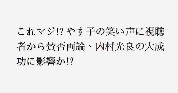 2、私もやす子さんの笑い声が気になりました。どうしても内村さんに気を遣って必要以上にリアクションしているようで、そんなに内村さんに気に入られたいのか、観客に笑いを誘導しているのか、他の大物でない出演者の時にも同じように笑うのか。しかし、あの笑いは逆効果と思いました。しらじらしくてこちらの気持ちが一気に冷めました。内村さんにとっては迷惑であったと思います。