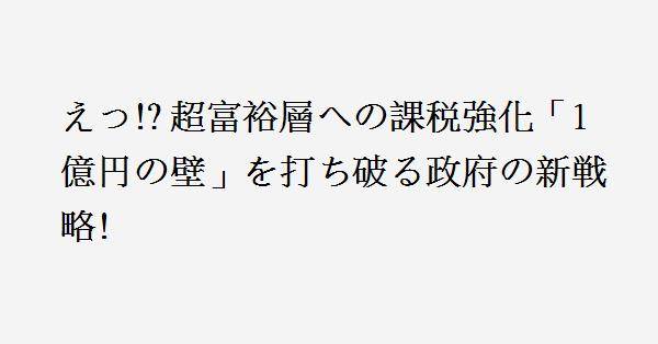 政府と与党は、「1億円の壁」と呼ばれる所得税の負担率が反転する問題に対し、所得が6億円を超える超富裕層への課税強化を進めている。現制度では給与所得に対する税率が最大55%に達する一方、金融所得の税率は一律20%であり、富裕層ほど税負担が軽減される。この不公平さを解消し、所得が高い人により負担を求めるための措置として、30億円を超える所得への課税を2023年から始め、さらに対象範囲の見直しが行われている。