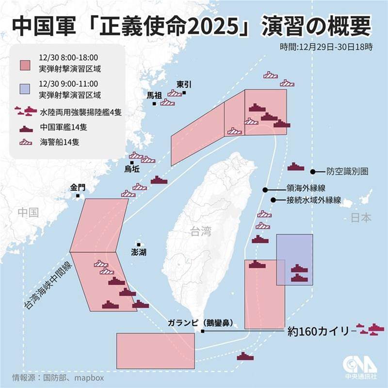 中国軍による軍事演習が台湾周辺で行われ、ロケット弾27発が発射された。演習は29日に中国側が発表し、30日に実弾射撃を実施。午前9時に17発が福建省平潭から基隆の北東約130キロの海域に、午後1時に10発が石獅から台南の西約93キロの海域に落下した。また、中国の軍用機71機、軍艦13隻、海警船15隻が台湾周辺で活動し、一部は台湾海峡の中間線を越えた。
