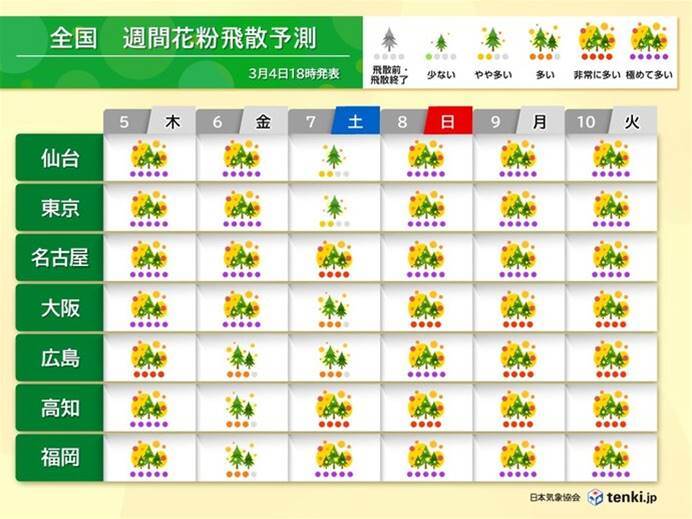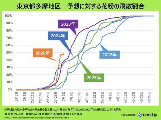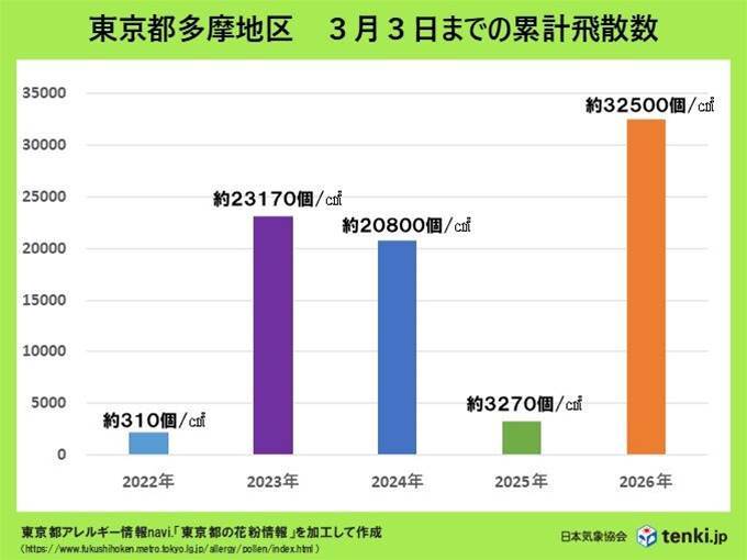 今年の花粉飛散量は例年を大幅に上回り、特に東京都多摩地区では深刻な状況です。3月3日までに約32500個/㎝²を記録し、昨年同時期の約3270個/㎝²の約10倍となっています。また、花粉の飛散ペースが速く、予測最大量の50%がすでに拡散。この勢いは九州から東北にかけピークを迎える予定で、特に晴天日が危険な飛散量となることが予測されています。雨の日でも大幅には抑えられず、万全な対策が求められています。