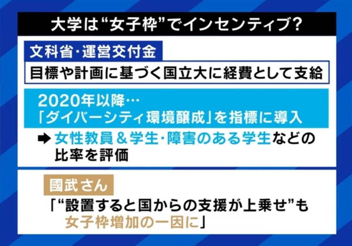 これらは、根本的な環境改善を通じて、男女平等に基づいた多様な人材確保につながります。「平等な競争と機会」という価値観を損なわず、多様性を追求できる社会を目指すべきではないでしょうか。現状の女子枠制度は、その一時しのぎにすぎず、むしろ議論を深める必要があると言えます。