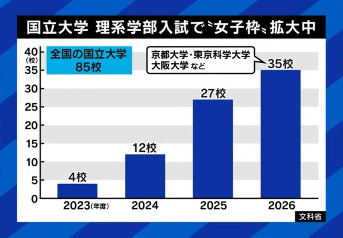 日本の大学入試で、特に理工系学部を中心とした「女子枠」の導入が拡大し、2023年度の4校から2026年度には35校と急増する見込みとなった。これに対して、多様な人材育成を支持する声がある一方、公平性や憲法との整合性に疑問を抱く声も上がっている。女子枠の導入背景には、理工系学部に女性が少ない現状や、ロールモデル不在の問題があるとされる。推進派はその解決策として意義を主張する一方、反対派は特定の性別への優遇措置が公平性を損ない、むしろ多様性を阻害する可能性があると指摘している。議論は、女性の理系進出をどう形にするかという社会問題へと波及している。