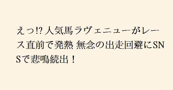 12月27日に開催される第42回ホープフルS・G1(中山競馬場・芝2000メートル)に出走予定だったラヴェニューが、12月25日に発熱のため出走を回避することになりました。ラヴェニューは競馬ファンの間で1番人気が予想されていた有力馬で、先月8日の東京での新馬戦を5馬身差で圧勝し注目を集めていました。管理する友道康夫調教師は「大きな異常はないが、無理はさせられない」と説明しています。