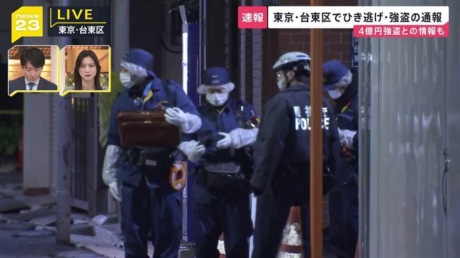 今夜、東京・台東区で大規模な強盗事件が発生しました。午後9時半ごろ、JR御徒町駅付近で、男女5人のグループが持っていた現金4億円入りのスーツケースを、3人組が力づくで奪い取り、車で逃走しました。付近では車の逆走や追跡が目撃され、緊迫した様子が伺えます。また、事件現場から50メートルほど離れた場所で、同時間帯にひき逃げ事件が発生し、50代男性が軽傷を負っています。警視庁は2つの事件の関連性を調査中で、一連の犯罪の背後に組織的計画の可能性があると見ています。