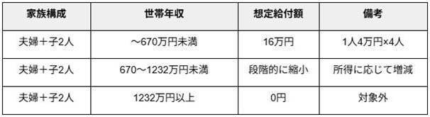 消費税引き下げよりも迅速な対応が可能で、支援の公平性も高いとされています。年収670万円未満の世帯が満額16万円を受け取り、670~1232万円未満の世帯は給付額が減額され、1232万円以上の世帯は対象外となります。給付開始は2025年末までの予定であり、効率的な再分配政策として注目されています。