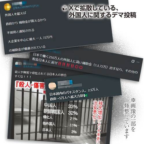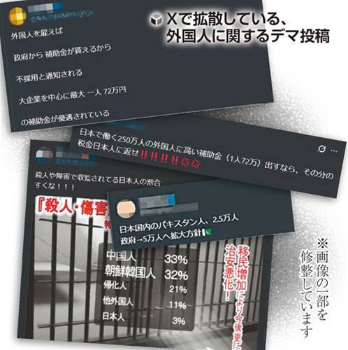 事件概要:衆院解散後、外国人に関する偏見や差別を煽るデマがSNS上で急拡散した。「外国人雇用に対して補助金が出る」とする誤情報が拡散され、1万4000回のリポスト、50万回以上の表示を記録。また、「国内のパキスタン人の受け入れ人数拡大」という虚偽情報なども拡散し、差別的なコメントが相次いでいる。これらの情報は外務省や厚労省が否定しており、統計や事実と大きく異なるものが多い。選挙が絡む状況において、大衆の偏見を助長するデマ拡散が激化している。