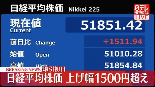 5日の東京株式市場で今年最初の取引日「大発会」が開かれ、日経平均株価の上げ幅は一時1500円超に達しました。昨年末でのアメリカ市場の堅調な動きを受け継いだ流れに加え、国内の高市政権による積極財政政策への期待感が市場を盛り上げ、全面的な株価上昇が見られました。懸念された国際的な不安要素であるベネズエラ情勢の影響はほとんどなく、証券各社は昨年の株価最高値の更新を予測するなど、楽観的な見通しを示しています。「午の尻下がり」という相場の格言を意識しつつ、さらなる成長が期待されています。株式市場は、順調な滑り出しを見せた幸先のよいスタートです。