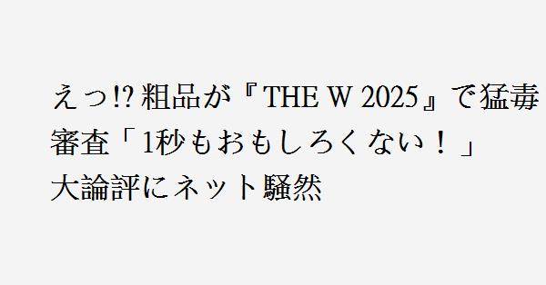 女芸人ナンバー1決定戦「THE W 2025」の決勝が10月13日に開催されました。審査員として霜降り明星の粗品が初めて参加。粗品はジェンダーに関係なく公平な審査をする意向を示しながらも、その辛辣な審査が話題となりました。特にAブロックのもめんと対電気ジュース戦では、粗品だけが電気ジュースを支持し、もめんとのネタについてはウケすぎと批判。