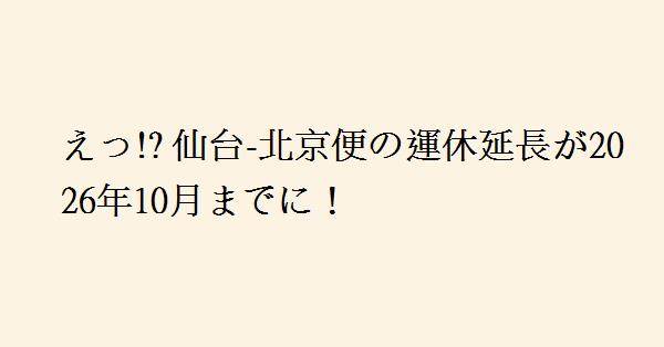 仙台空港と中国の北京を結ぶ定期便が、2026年10月まで運休期間を延長することが決定しました。中国国際航空が運航するこの便は、元々2025年10月27日から2026年3月27日まで運休する予定でしたが、機材の調達が難しいことから運休期間がさらに延ばされることになりました。また、仙台-上海便も同様に機材繰りのため2025年12月16日から2026年3月28日まで運休が決定されており、現在は仙台空港から中国への直行便はすべて運休状態にあります。