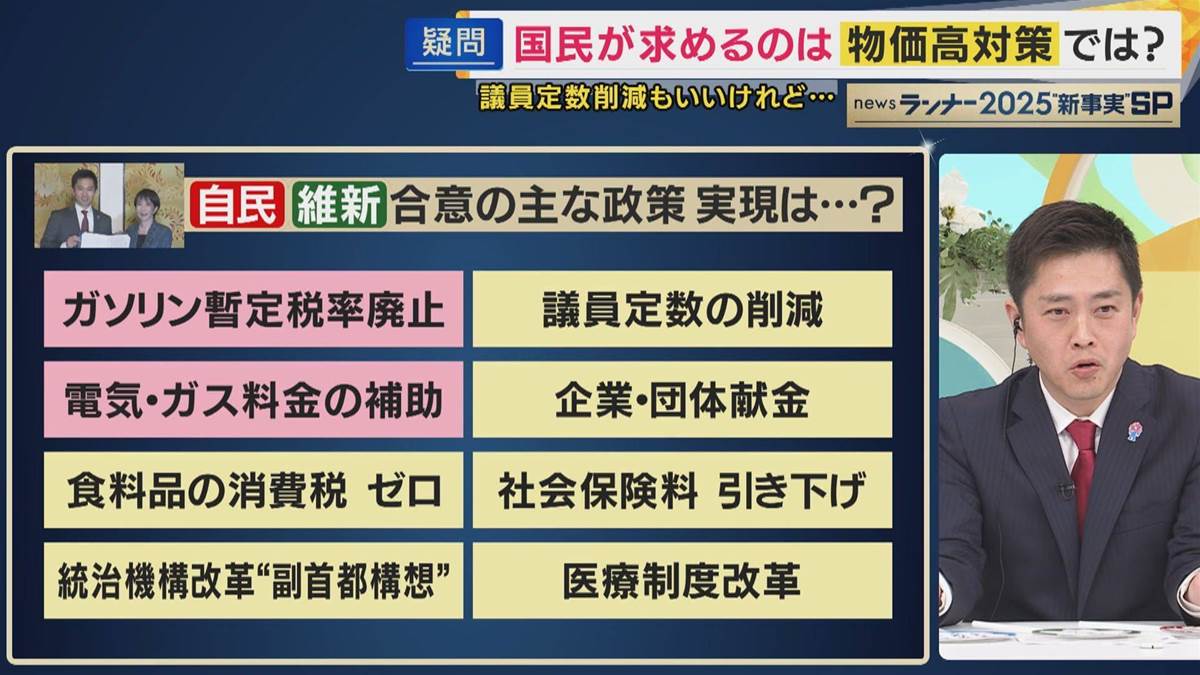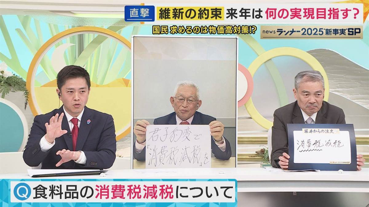2025年12月26日、関西テレビの「newsランナー」に出演した日本維新の会の吉村洋文代表は、食料品の消費税をゼロにすべきと強調しました。吉村氏は、その財源として税収の上振れにより5兆円が確保できると述べ、特に子育て世帯や低所得者層に対する支援の必要性を指摘しました。同じく出演した元明石市長の泉房穂参院議員と京都大学の藤井聡教授も、消費税減税を求め、これを政治上の主要な目標に掲げるべきと主張しました。