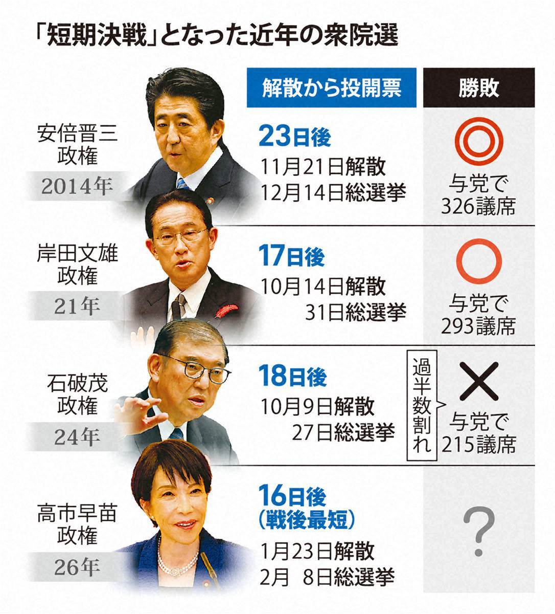 日本の高市早苗首相は、今月23日に衆議院を解散し、「27日公示—2月8日投開票」で総選挙を行うことを発表しました。この日程は解散から16日後の実施で、戦後最短となります。短期間での選挙は、通常、与党に有利とされますが、過去には大敗した例もあります。近年、投票日までの期間が短縮されつつあり、自治体の事務負担や政党の準備の不十分さに加え、有権者が候補者の情報を集める時間が少なくなる懸念があります。2021年には岸田政権下で17日後に実施され、自民党は絶対安定多数を確保。一方で、24年の石破茂政権下では18日後の選挙で与党が大敗しました。選挙の短期間実施による政治的影響が注視されています。