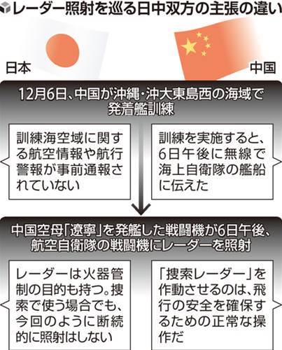 沖縄本島南東の公海上空において、6日に中国空母「遼寧」発艦の戦闘機が、日本の航空自衛隊機に対し2回にわたりレーダー照射を行った。この行為は約30分間断続的に続き、日本はこれを危険な挑発行為と主張し問題視している。中国側は訓練開始を事前通告したとする音声を公開し、自らの行為を正当化。