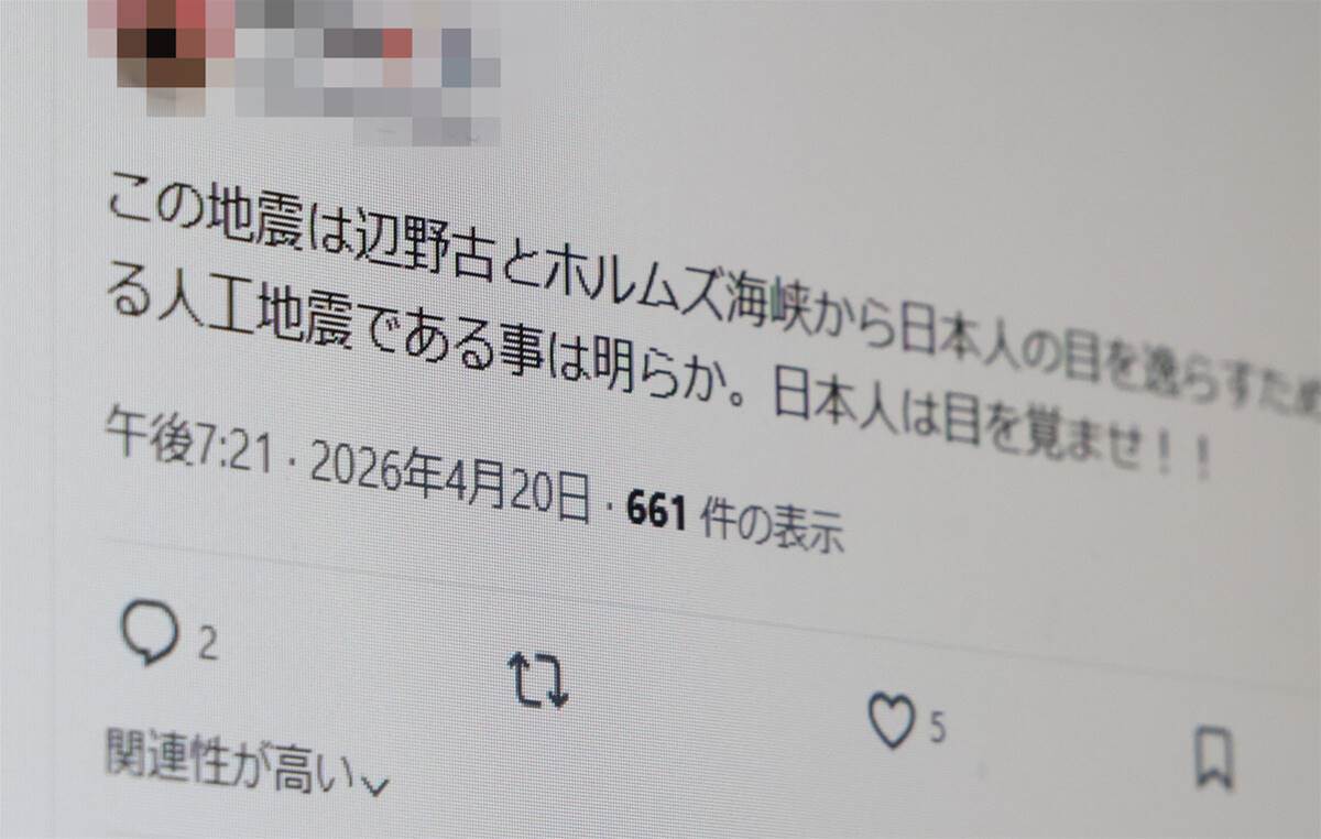青森県で震度5強を観測した地震に関連して、「人工地震」など根拠のないデマがSNSで拡散された。震源は三陸沖で、21日までにその内容が6000件以上投稿されており、追従する投稿もある中で、デマを指摘する内容は全体のわずか2割。特定の探査船が地震を引き起こしたという主張も散見されたが、海洋機構は否定。他にもAI生成とみられる偽動画が共有され、被害拡大の恐れが指摘された。専門家は、公的機関の情報確認を推奨している。