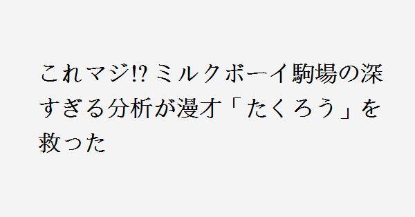 2、ミルクボーイが落ち目だなんだ言ってる記事を見た事あるが、大阪の劇場で漫才を磨き、新ネタも作りTHE MANZAIではたけし賞も獲得。しっかり漫才に向き合っている駒場さんの愛があり今回の的確なコメントに繋がり、今現在のミルクボーイを物語っていると感じた。