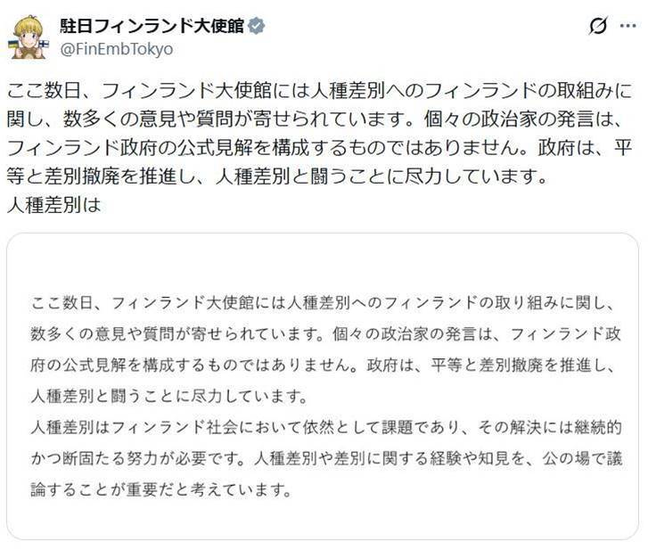 駐日フィンランド大使館は12月15日、公式Xで「人種差別と闘う」との声明を発表しました。フィンランドでは、右派フィンランド人党の国会議員がアジア人を揶揄する“つり目”の写真をSNSに投稿し、騒動となっています。これに対し、フィンランド政府は差別撤廃に努める姿勢を示し、ペッテリ・オルポ首相も記者会見で議員の行動を非難しました。