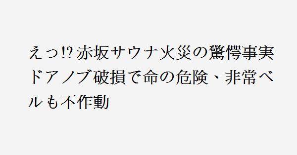 4、この事件のニュース記事で「赤坂サウナ火災」というのをよく見かけるけど、火災じゃなくて「赤坂サウナ閉じ込め」じゃないのかな。閉じ込められた結果の延長線上に火災があったのかもしれないけど、あの状況下で火災がなくても救出は難しかったと思う。だって非常ボタンの電源入ってないんだもん。私がよく行く公衆サウナは、見回りの人が度々サウナを出入りします。ああいう状況なら見つけてもらえたかもしれない。このサウナはプライベートサウナ。プライベートを売りにしているからこそ発見も遅くなる。サウナに閉じ込められて助けがないとか普通に考えて地獄ですよね。
