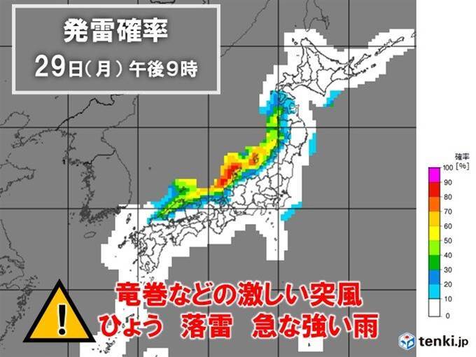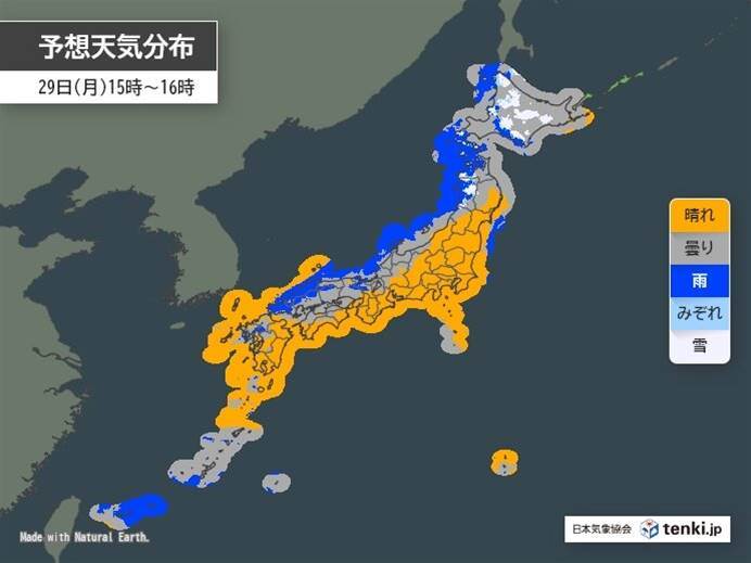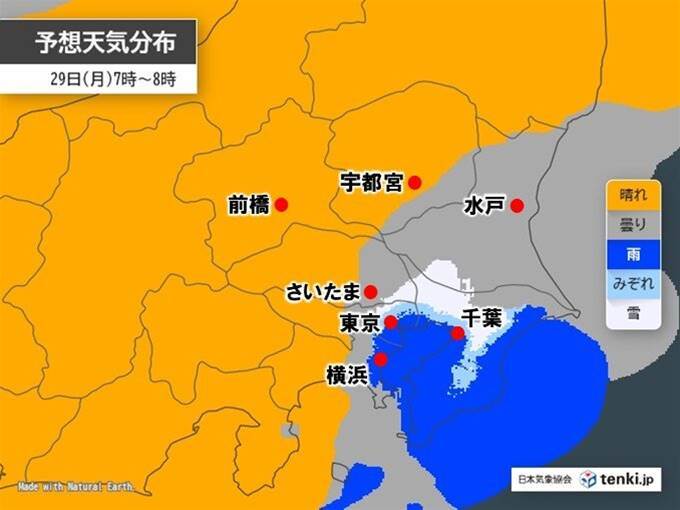 明日29日、関東地方を含む日本各地で不安定な気象条件が予想されています。気圧の谷が近づくことで、特に北海道や本州の日本海側では断続的な雨や雪が見込まれます。関東では、明け方から昼前にかけて千葉県を中心に雨や雪が降る可能性があり、多少の積雪に注意が必要です。最高気温は東京都心で12℃と予想されており、ほぼ平年並みです。日本全体的に、気温の乱高下や大気の不安定さによる落雷や竜巻などの激しい天候に警戒が必要です。