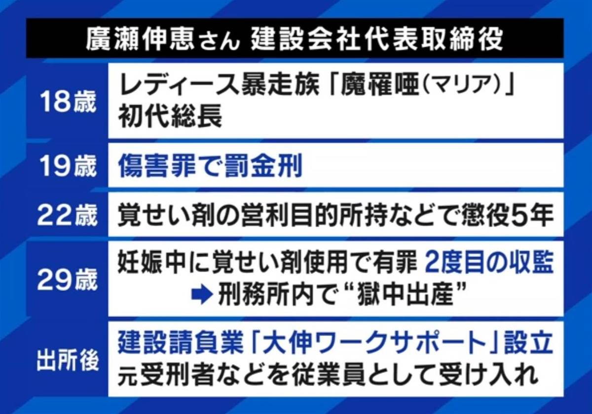 2024年のデータによると、再犯率が46.2%を占める中、元受刑者たちが更生後も社会的偏見と現実の困難に直面している現状が浮き彫りになった。「ABEMA Prime」に出演した廣瀬伸恵氏は、10代の頃に暴走族の初代総長を務め、薬物売買により2度の服役を経験した過去を語った。廣瀬氏は現在、従業員の大半が元受刑者である建設会社を経営しており、更生支援に尽力しているが、受刑者の社会復帰には再犯や困難が多いことを訴えた。廣瀬氏は、自らの更生への努力や社会復帰を目指す者たちの現状について「失敗した者にセカンドチャンスを」と社会に理解を求めた。