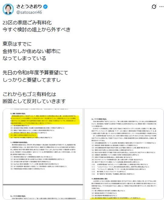 6月に初当選した佐藤沙織里都議は、自身のX(旧ツイッター)で東京23区のゴミ有料化について小池知事に反対の姿勢を示した。小池知事はフジテレビのインタビューで効果が確認されている多摩地区のゴミ有料化を23区にも導入する意向を示唆し、区民の行動変容を促したいと述べたが、佐藤都議は「東京は金持ちしか住めない都市になっている」と指摘。