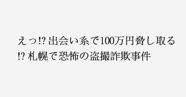 8月23日、札幌市白石区の宿泊施設で、30代男性が出会い系サイトで知り合った23歳の女性に「3人で性行為しよう」と誘われました。しかし、当日現場に来た26歳の男性から女性を盗撮するようそそのかされ、男性はスマートフォンを脱衣場に置いて盗撮を実行しました。その後、女性がこのスマートフォンを持ち出し、「警察に言う」などと脅迫し、示談金として男性から100万円を現金で脅し取った疑いがあります。