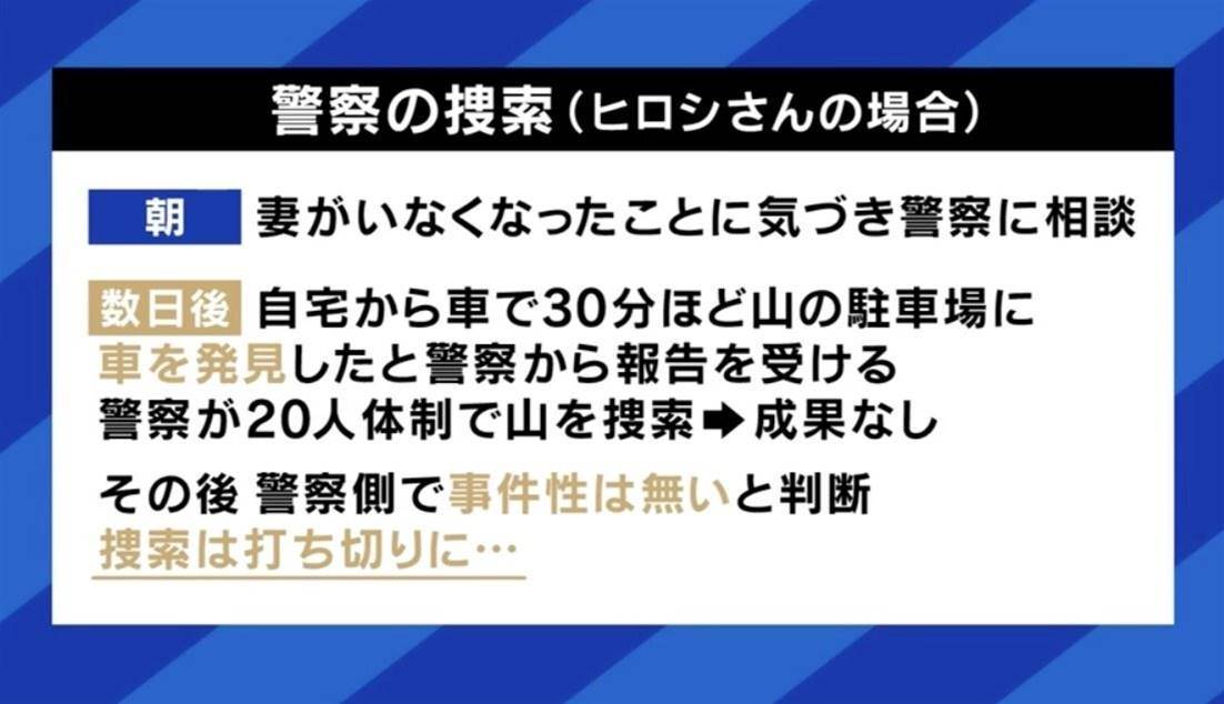2025年8月、群馬県に住むヒロシさん(60代)は、40年以上連れ添った妻の失踪を経験しました。妻は6枚の手紙を残し、自宅から出て行ったと考えられています。手紙には、「一緒に暮らしてくれてありがとう」といった感謝や謝罪の言葉が綴られていました。警察に通報したヒロシさんは、数日後に妻の車が山で見つかったものの、妻の行方は半年経っても不明です。不安と後悔を抱くヒロシさんは、探偵事務所の力も借りて捜索を続けています。この事件は、成人の失踪事件に対する警察の対応の曖昧さと限界を浮き彫りにしています。