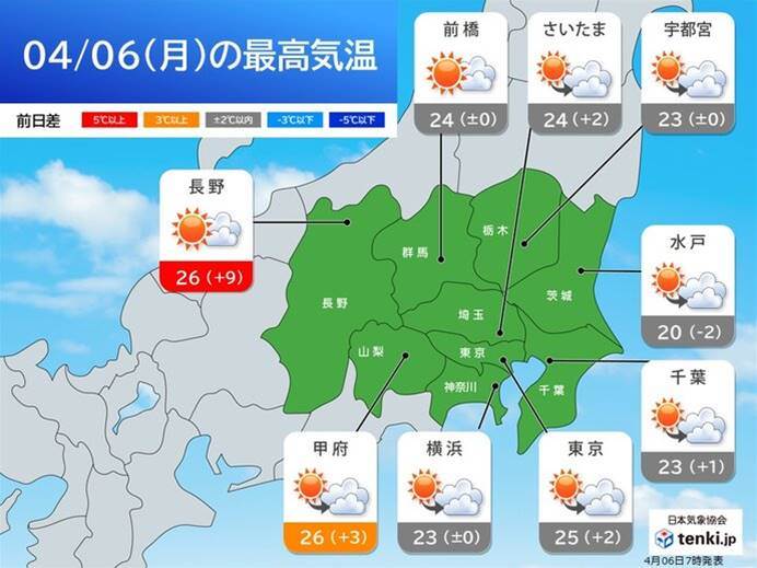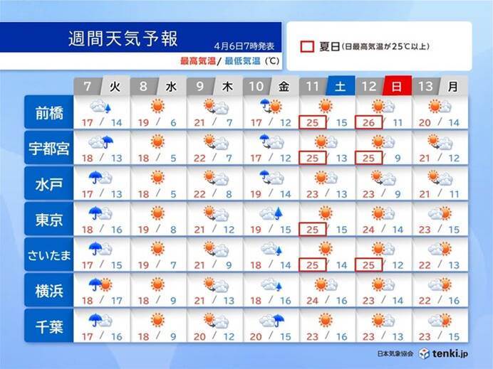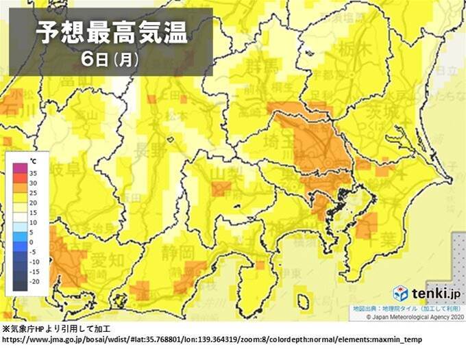 東京都心で今年初めて夏日予想された6日、気温が25℃まで上昇する見込みです。高気圧に覆われた関東地方は広く晴れ渡り、強い日差しと暖かい空気の影響で、春とは思えない暑さになると予測されています。内陸部では埼玉や群馬でも同様の気温が予想されており、体が暑さに適応していないこの時期、熱中症への警戒が必要です。週後半から週末にかけて再び夏日が増えるため、暑熱順化や水分補給といった対策が求められています。