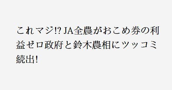 2、一番の問題は、おこめ券と交換される事によって米価格の適正価格への値下がりが遅れ、場合によっては充分な値下がりしない可能性すら出てくる事。JAは一見配慮してるように見えるが、結局は米価格が適正価格まで値下がりしてはJAがかなりの損失を被るので、米価格を維持するための選択。決して国民のためではなくJAのための方策に過ぎない。